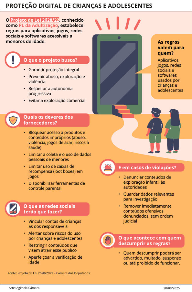 A Câmara dos Deputados aprovou, na quarta-feira, 20, o projeto de lei que cria regras para a proteção de crianças e adolescentes quanto ao uso de aplicativos, jogos eletrônicos, redes sociais e programas de computador.