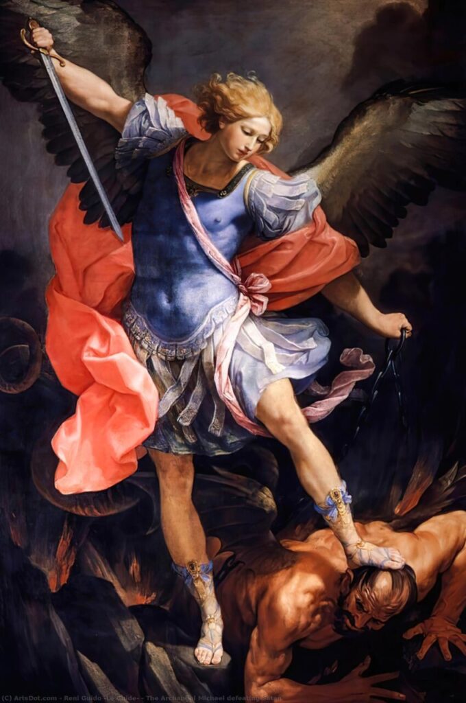 “São Miguel Arcanjo, defendei-nos no combate, sede nosso refúgio contra a maldade e as ciladas do demônio. Ordene-lhe Deus, instantemente o pedimos, e vós, príncipe da milícia celeste, pelo Divino Poder, precipitai no inferno a Satanás e a todos os espíritos malignos, que andam pelo mundo para perder as almas. Amém”.