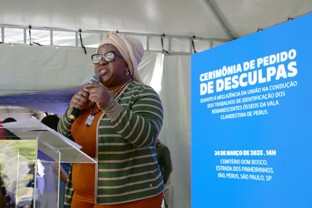 “O Ministério dos Direitos Humanos e da Cidadania, em nome do Estado Brasileiro, pede desculpas aos familiares dos desaparecidos políticos durante a ditadura militar brasileira, iniciada em 1964, e à sociedade brasileira pela negligência, entre 1990 e 2014, na condução dos trabalhos de identificação das ossadas, encontradas na vala clandestina de Perus, localizada no Cemitério Dom Bosco em São Paulo”, disse a ministra a familiares das vítimas.