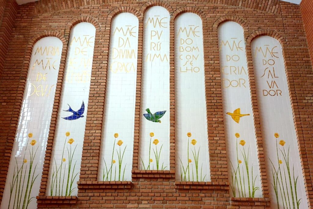 As rampas, o jardim e o oásis. Para passar por este “portal”, deve-se percorrer uma rampa ladeada por painéis com a Ladainha Lauretana, oração popular e cristológica, na qual contemplamos um mistério que convida a meditar a partir das invocações sobre a Virgem. As 28 invocações, em letras em ouro sobre azulejo branco, estão sobre flores (flor-de-lis do campo), símbolo de pureza, virgindade e beleza espiritual, e pássaros da fauna brasileira (andorinha, canarinho da terra, beija-flor, sabiá, maritaca e tucano) que habitam esse jardim, conferindo ao espaço características do Cântico dos Cânticos (cf. Ct 4,12), com o qual a Virgem faz paralelismo, sendo ela o novo jardim plantado, preparado e cultivado (sem a mancha do pecado), do qual nasce frutos da árvore da vida (Jesus Cristo). Ainda do Cântico dos Cânticos, o artista se inspirou nas expressões “pequeno Jardim fechado” (Ct 4,12) e “fonte selada” (Ct 4,12), para retratar a Virgem Maria como jardim fechado, recordando a passagem evangélica da Anunciação, na qual o anjo diz que ela conceberia e daria à luz um filho, permanecendo virgem, verdades preanunciadas no Cântico dos Cânticos, no qual confere uma narração a respeito de um jardim em que está a fonte das águas que formam os quatro rios que banham os quatro cantos da terra. Esse jardim é a Basílica, lugar em que todos são acolhidos e banhados com essas águas que geram vida nova. A Virgem Maria nesse lugar, é o portal do jardim, pelo qual peregrinos são acolhidos e direcionados ao centro, o altar para a eucaristia. Não por acaso a Imagem está no extremo da nave Sul, ou seja, acolhendo e direcionando a Cristo.