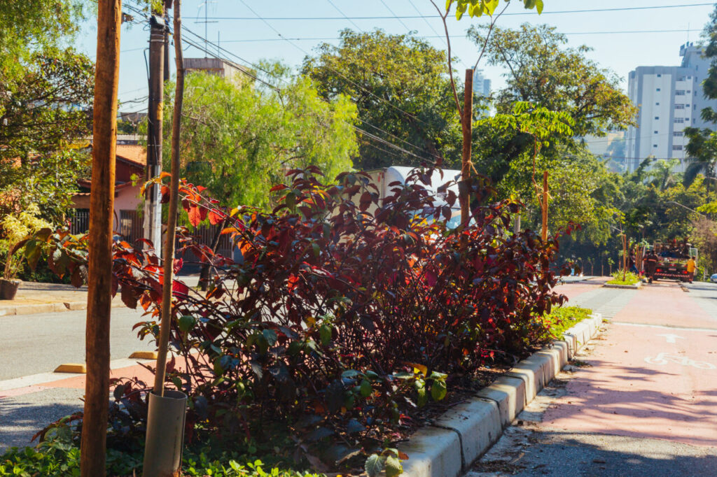 Como o corredor ainda está em fase inicial, as árvores são jovens e de pequeno porte. Bruno compartilhou à reportagem que o ideal é que o corredor se estabeleça no solo, em uma faixa gramada com árvores plantadas próximas à sarjeta, criando uma área contínua e permeável, modelo já visto em bairros como o Jardim Europa.