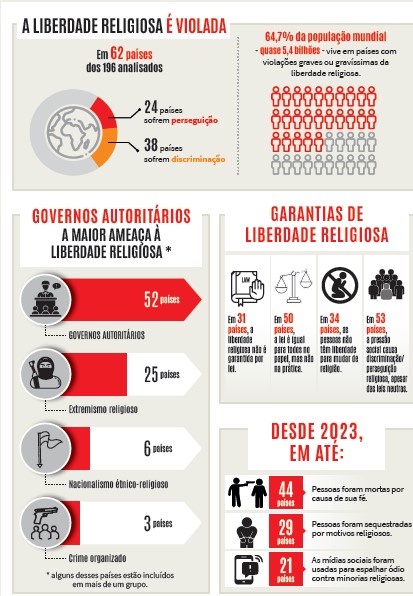 O relatório revela que a liberdade religiosa sofreu graves violações em 62 países. Desses, 24 estão classificados como de “perseguição” e 38 como de “discriminação”. Em 75% dos casos, a situação piorou nos últimos dois anos, especialmente na China, Índia, Nigéria e Coreia do Norte, onde a repressão se tornou mais sistemática.