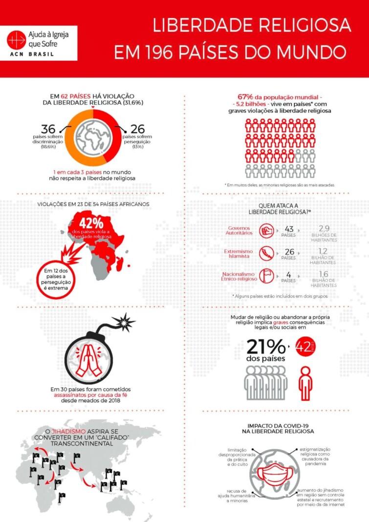 O Relatório aponta que o direito fundamental à liberdade religiosa não foi respeitado em 62 (31,6%) dos 196 países, entre 2018 e 2020. Em 26 desses países as pessoas sofrem perseguição e, em 95% deles, a situação ficou ainda pior durante o período analisado. Nove países aparecem nesta categoria (Perseguição Religiosa) pela primeira vez: sete na África (Burkina Faso, Camarões, Chade, Comores, República Democrática do Congo, Mali e Moçambique) e dois na Ásia (Malásia e Sri Lanka).