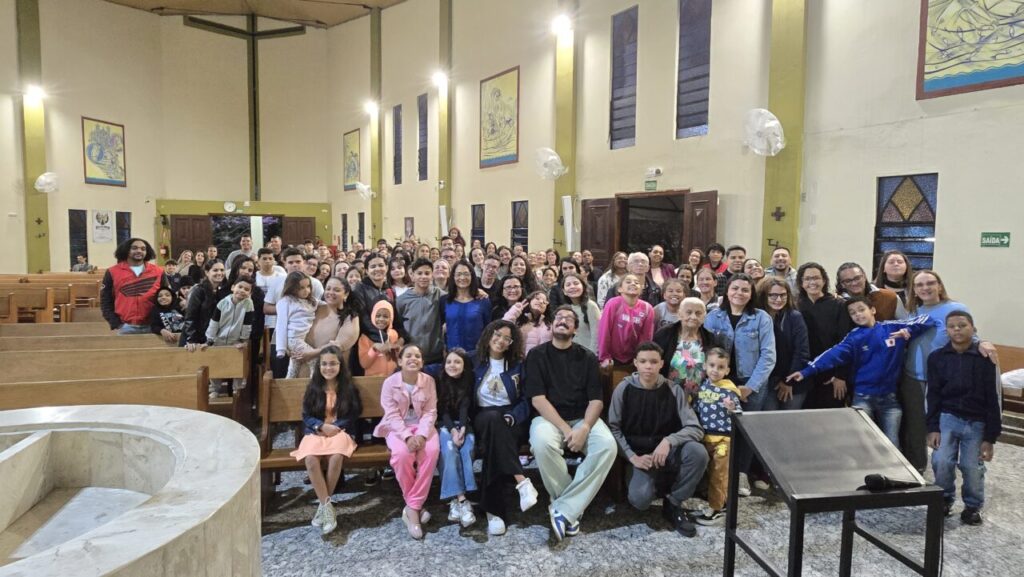 Na tarde do sábado, 5, na Paróquia Nossa Senhora Aparecida, Decanato Santa Isabel e São Zacarias, 150 pessoas, entre catequizandos e seus familiares, participaram de um momento de espiritualidade com o tema “Família: Peregrina de Esperança”, organizado pela Pastoral Familiar e pela equipe de Iniciação à Vida Cristã (IVC). Inspirado na proposta da Campanha da Fraternidade e nas palavras do Papa Francisco, o encontro destacou a Igreja como extensão da família, resgatando o valor da fé vivida em comunidade e do compromisso familiar na transmissão dos valores cristãos. Ao final, houve um café comunitário e a participação na missa. (por Priscila Rocha)