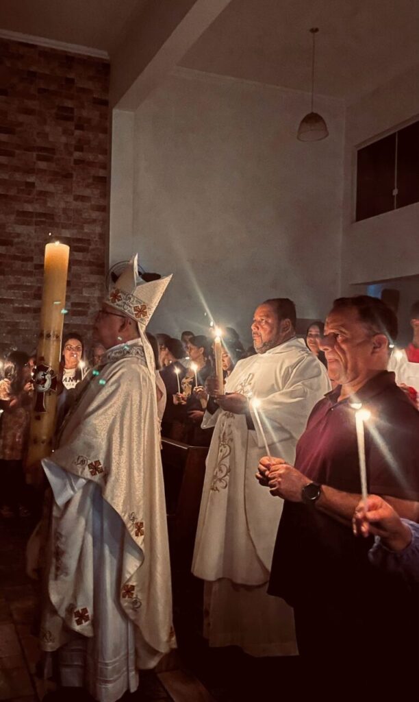 No Sábado Santo, 19, a Vigília Pascal reuniu todas as comunidades da Paróquia e foi concelebrada pelo Padre Gleidson Luís Novaes, Pároco. Na homilia, Dom Carlos recordou que a Páscoa é “um momento propício para olharmos para a nossa história, para vermos como Cristo realiza maravilhas em nós”. Disse, ainda, que na Vigília Pascal sucedeu uma grande explosão, “um ‘big-bang’, um novo começo, um novo universo. Agora, Deus faz novas todas as coisas, tudo se torna novo!”