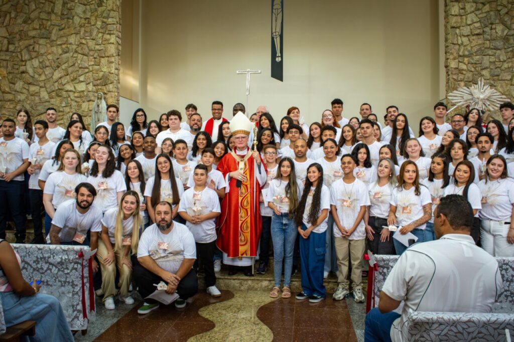 a 65 jovens e adultos. Concelebrou o Padre Wagner Aparecido Scarponi, Pároco, com a assistência do Diácono Maurício Luz de Lima. (por Marcelo Fagner)