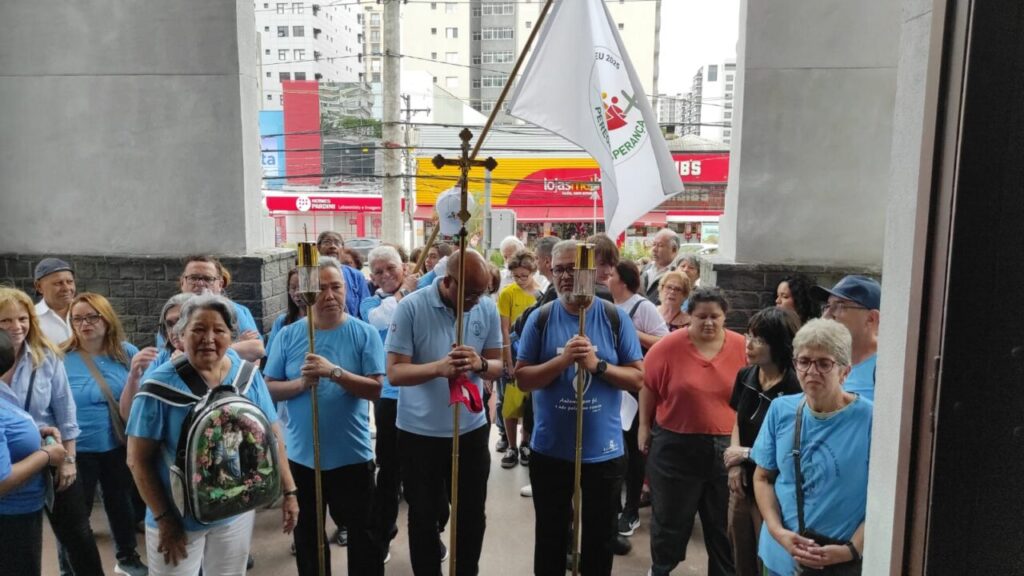 Por fim, os participantes receberam o certificado de peregrinos do Ano Jubilar da Esperança, um Terço e um chaveiro em formato de pé, simbolizando os caminhos por eles percorridos.