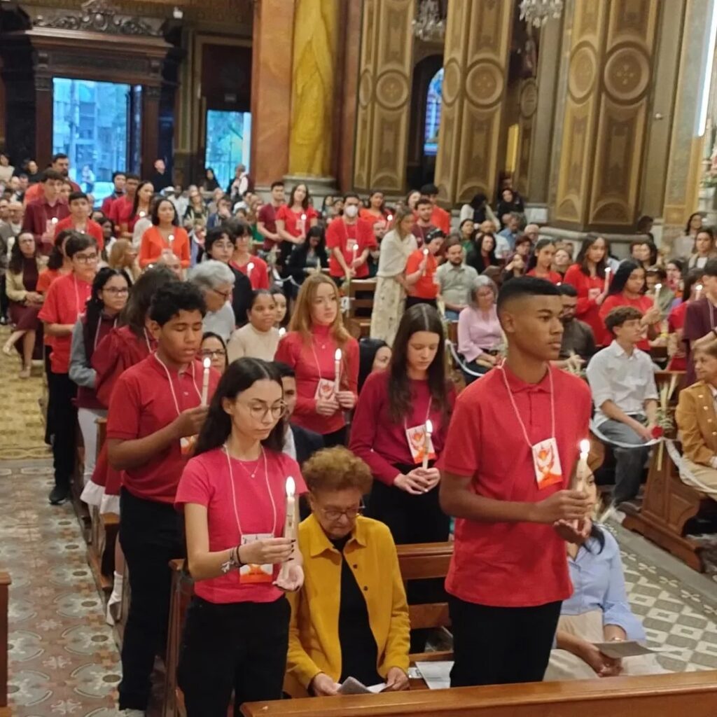 Em missa na Paróquia Imaculado Coração de Maria, Decanato São João Evangelista, no sábado, 2, presidida por Dom Rogério Augusto das Neves, Bispo Auxiliar da Arquidiocese na Região Sé, 43 jovens e adultos receberam o sacramento da Crisma. Concelebraram os Padres Welington Cardoso Brandão, CMF, Pároco, e Pedro Divino de Vilas Boas, CMF, Vigário Paroquial. (por Fernando Rosa)