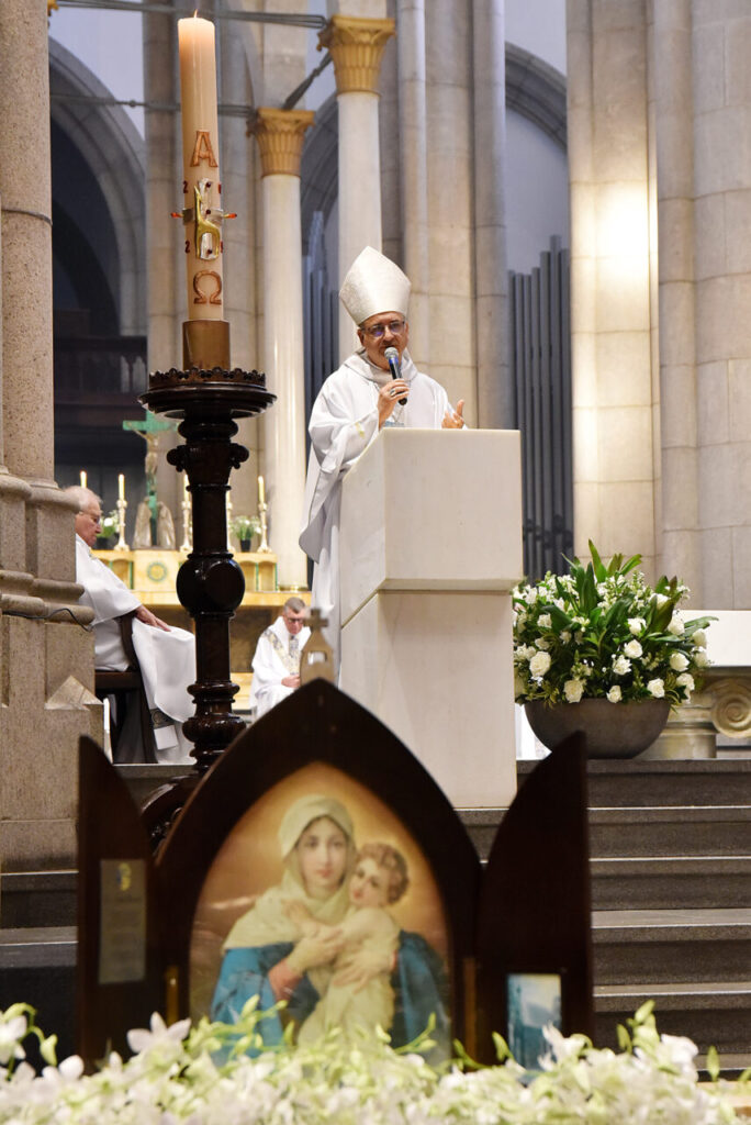 “Neste dia em que recordamos os 75 anos da Campanha da Mãe Peregrina, somos introduzidos na esperança e convidados a refletir sobre a sinodalidade: fazer o caminho e caminhar juntos”, disse Dom Rogério, no começo da homilia.