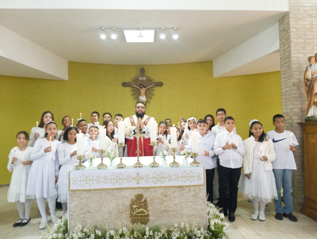 No domingo, dia 1º, 24 crianças receberam a 1ª Eucaristia em missa na Paróquia Cristo Libertador, Decanato Santa Isabel e São Zacarias, presidida pelo Padre Maycon Wesley Silva, Pároco. (por Daniele Aleixo)