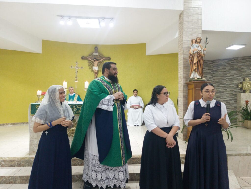 No domingo, 31 de agosto, na Paróquia Cristo Libertador, Decanato Santa Isabel e São Zacarias, foi realizada a missa de envio da jovem Yasmim Farias de Oliveira (na foto, com véu na cabeça) para o convento da Comunidade Nossa Senhora Serva da Alegria. A Eucaristia foi presidida pelo Padre Maycon Wesley Silva, Pároco. (por Daniele Aleixo)