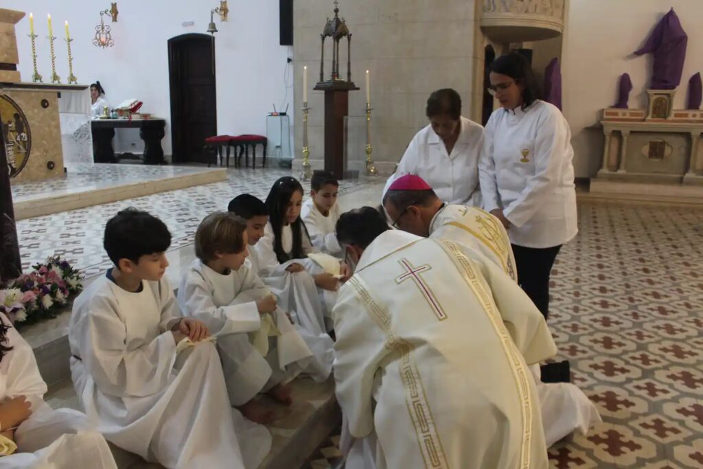 Dom Carlos Lema Garcia, Bispo Auxiliar da Arquidiocese e Vigário Episcopal para a Educação e a Universidade, presidiu, na noite da Quinta-feira Santa, 2, a Missa da Ceia do Senhor na Paróquia Nossa Senhora dos Remédios, Decanato São Tiago de Alfeu, com o rito do lava-pés. Participaram crianças da Catequese Infantil e adolescentes e jovens do grupo de Perseverança que se preparam para a Crisma. Concelebrou o Padre Ricardo Cardoso Anacleto, Pároco. (por Pascom paroquial)