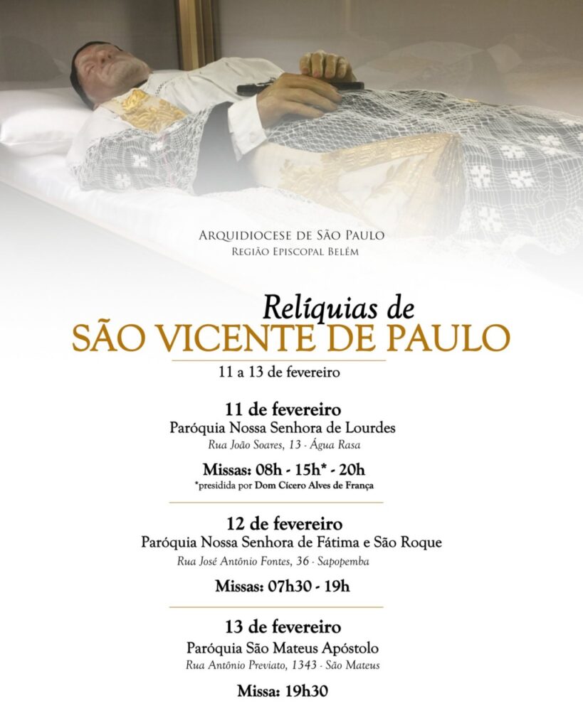 Como parte das comemorações dos 400 anos da Congregação da Missão (CM) de São Vicente de Paulo, iniciadas em 12 de abril do ano passado, suas relíquias e a réplica do seu corpo em cera, provenientes da Itália, chegam em peregrinação à Arquidiocese de São Paulo e devem percorrer todas as dioceses do Brasil até março de 2028. O intuito é divulgar a espiritualidade Vicentina e despertar nos fiéis o desejo de conhecer a vida de São Vicente de Paulo, padroeiro das Associações de Caridade. Na Região Belém, a peregrinação das relíquias começará no dia 11 de fevereiro, às 15h, na Paróquia Nossa Senhora de Lourdes, Decanato Santa Maria e São José, em missa presidida por Dom Cícero Alves de França, Bispo Auxiliar da Arquidiocese naquela região. Já no dia 12, as relíquias estarão na Paróquia Nossa Senhora de Fátima e São Roque, Decanato São Timóteo, e, no dia 13, na Paróquia São Mateus Apóstolo, Decanato Sant’Ana e São Joaquim. (por Fernando Arthur)