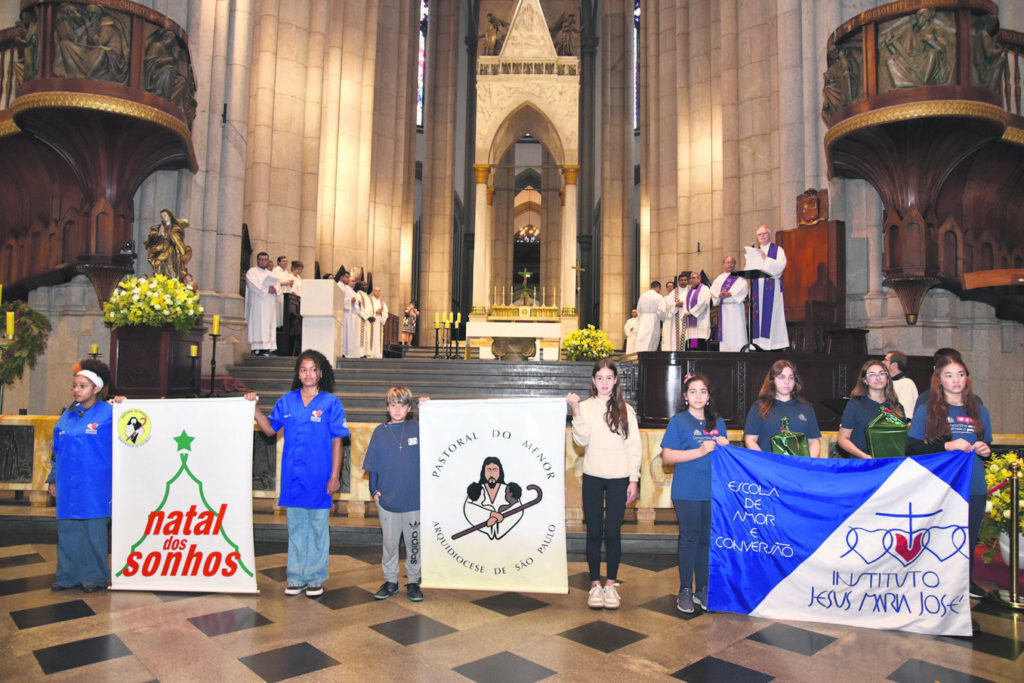 Na manhã chuvosa da terça-feira, 9, cerca de 1,5 mil crianças e adolescentes se reuniram na Catedral Metropolitana Nossa Senhora da Assunção para participar do “Natal dos Sonhos”. A celebração da Palavra foi conduzida pelo Cardeal Odilo Pedro Scherer. Concelebraram Dom Edilson de Souza Silva, Bispo Auxiliar da Arquidiocese na Região Lapa; o Cônego Marcelo Monge, Vigário Episcopal da Caridade Social; Padre Douglas da Silva Gonzaga, Assessor Eclesiástico arquidiocesano da Pastoral do Menor, e o Padre Miguel Cambiona. Seminaristas e professores de colégios católicos também participaram.