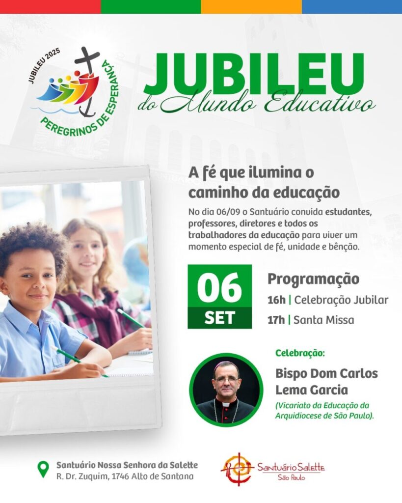 Em 6 de setembro, no Santuário Nossa Senhora da Salette, acontecerá o Jubileu do Mundo Educativo, com programação a partir das 16h e missa às 17h, a ser presidida por Dom Carlos Lema Garcia, Bispo Auxiliar de São Paulo e Vigário Episcopal para a Educação e a Universidade. São especialmente convidados a participar estudantes, professores, diretores e todos os trabalhadores da educação. O Santuário está localizado na Rua Dr. Zuquim, 1.846, no Alto de Santana. (por Redação – com informações do Facebook do Santuário Nossa Senhora da Salette)