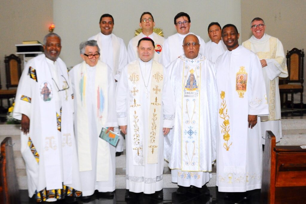 Em missa presidida por Dom Cícero Alves de França, no sábado, 8, os fiéis da Paróquia Nossa Senhora Aparecida e São Luciano, Decanato Santa Maria Madalena, comemoraram os 25 anos de ordenação presbiteral do Padre Cláudio de Oliveira, Pároco (de casula na foto, à esquerda do Bispo Auxiliar da Arquidiocese). Concelebraram presbíteros atuantes na Região, entre eles o Padre Reginaldo Donatoni, Decano, e o Cônego José Miguel de Oliveira, Vigário Geral-adjunto regional.