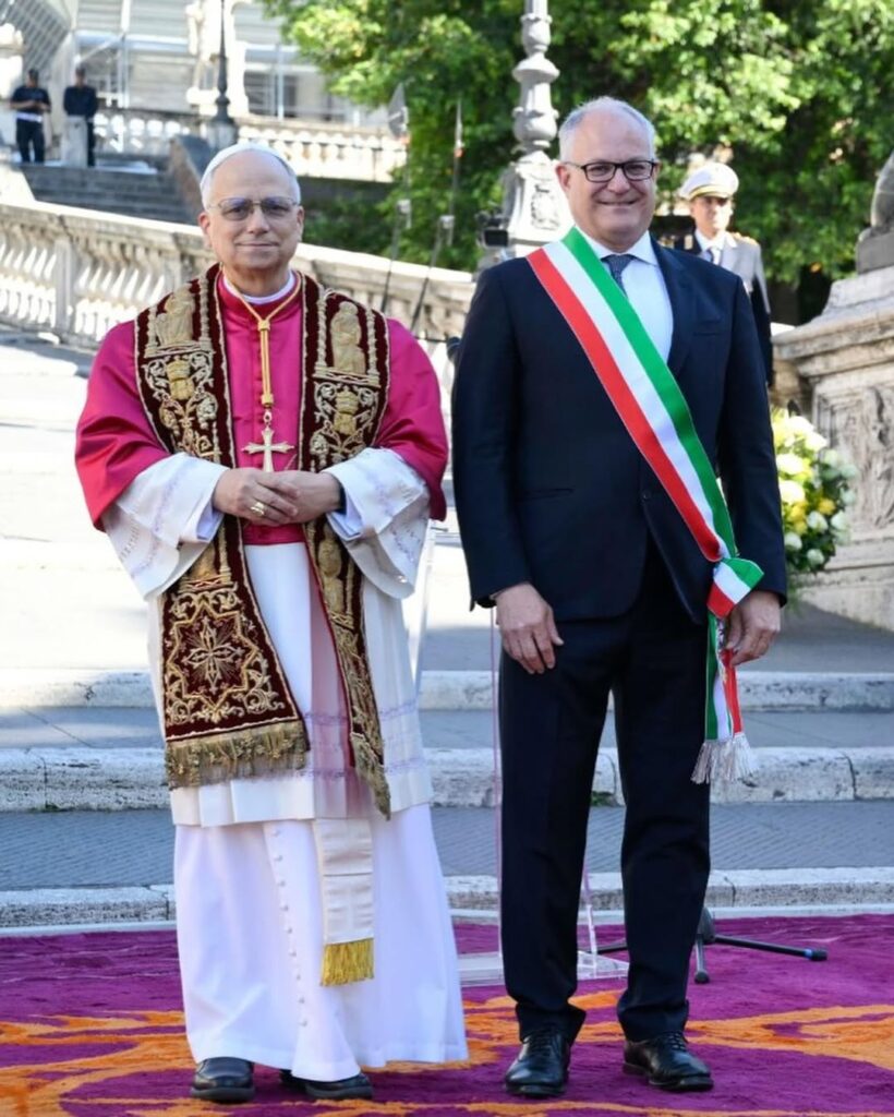 No dia de sua posse como Bispo de Roma, no domingo, 25, Leão XIV recebeu uma homenagem do prefeito da cidade, Roberto Gualtieri, aos pés do Capitólio romano, sede da administração cívica e democrática.